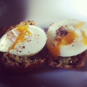 So this mornings breakfast was 2 poached eggs (seasoned with pepper) on top of a gluten free, wheat free brown roll. Instead of butter i spread pesto on top.