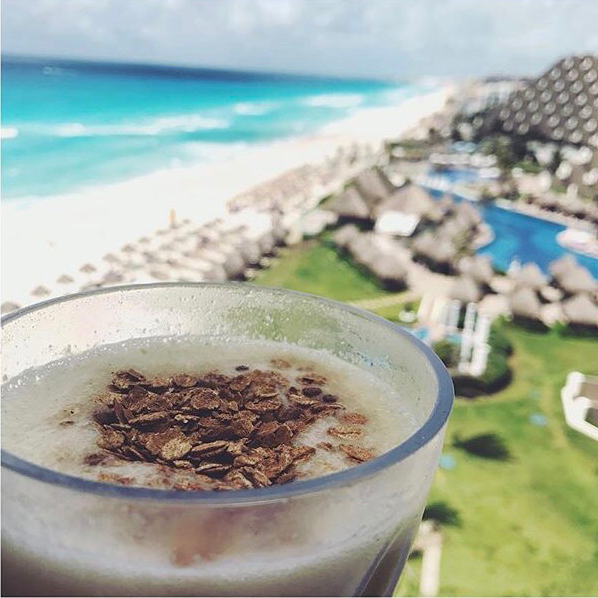 Breakfast with a view in Cancun using my travel blender, protein powder and almond milk.