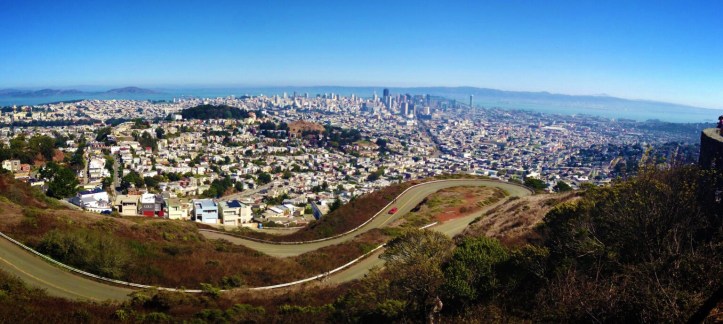 The 360 degree panoramic views you will experience at the top of Twin Peaks – two hills standing over 920 feet tall in the geographical centre of San Francisco, is something I will never get bored of visiting. Now, you can drive to the top or visit the peaks on a tour bus but I can assure you there is no better way to truly experience the breath taking views of the city, the bay, the ocean and California beyond, than to hike to the top. Be sure to make your first visit on a ‘good weather’ day, as the last thing you will want to find is the city below covered in cloud. Although I say ‘first visit’, as I think the famous ‘fog’ encroaching the city from the west on a cold day, can make fantastic viewing for someone that has been before. Twin Peaks is a popular place for tourists AND locals. On the way up you will most likely pass runners, cyclists and if your lucky, a few dog walkers and their furry companions! Although, the cute dogs might not be the only wildlife you encounter on the hike, racoons and skunks are also known to hang out nearby. While i was there, I got to see a couple of Red Tail Hawk’s gliding in the air (not that high) above me! When you get to the top there are two hills to trek, to help you observe the whole city. You’ll find strong winds and fog coming from the west, while sun and warmth immerse the east of the city. In-between the crest of the two hills you will find a helpful map of the bay area that can come in useful when your trying to remember what a certain park or road, you are looking at, is called. The convenient map is right next to some even more convenient bathrooms!